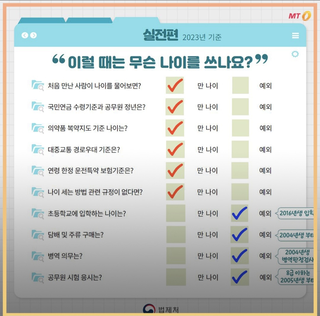 만 나이 적용으로 인해 기존에는 미성년자였던 시민들도 이제는 대구분으로 성인으로 취급됩니다. 이러한 만 나이 적용은 시대적 흐름에 맞춰 국가적으로 책정된 것이며, 필연적임을 인식하는 것이 필요합니다. 이러한 적응은 여러분이 더 나은 시민으로서 성장하기 위해 필요한 단계이며, 기존의 것들을 쉽게 변화하지 않으면서 새롭게 변화된 것들도 적극 챙겨야 합니다.